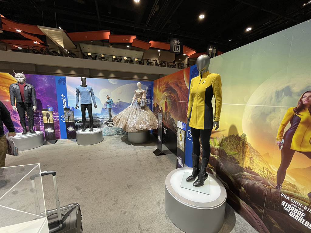 I walked to the gorgeous “Star Trek: Strange New Worlds” display next, checking the outside walls where giant images of the new crew were displayed.  Inside the display were many costumes along with their concept art. The details of the costumes blew me away: