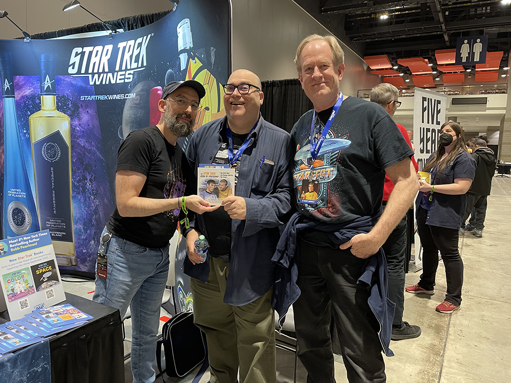 I visited with “Star Trek” author Robb Pearlman at the Star Trek Wines booth. He has written some of the most fun books, starting with Fun with Kirk and Spock and the more recent Star Trek Discovery: The Book of Grudge and Star Trek: Body By Starfleet. He introduced me to his collaborator Jordan Hoffman on The Star Trek Book of Friendship: You Have Been, and Always Shall Be, My Friend.  And Robb showed me proof copies of his upcoming Star Trek: The Girl Who Made the Stars (adaptation of the Short Trek) and the board book Star Trek: My First Book of Space written by upcoming Starfest science guest and “Star Trek” science consultant Dr. Erin MacDonald.  Next I learned about a couple of great new Star Trek wines with a bottle from Risa, likely premiering at Star Trek Las Vegas, and their first spirits, Romulan Ale!  They are soliciting input from fans online for what Romulan Ale should actually be!  The glass bottle for Romulan Ale was on display, and it’s just stunning!