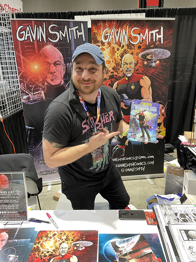 I journeyed into the giant Exhibit Hall, where the Official Merch booth was located front and center.  Lots of great T-shirt choices, pins, lanyards, jewelry and even Geordi teddy bears! I found author John Jackson Miller at the Heroes in Action table. He was selling the recent “Star Trek: Coda” trilogy from Gallery Books that wraps up the entire Star Trek literary universe! Each had a signed bookplate by authors Dayton Ward, James Swallow and David Mack. John was happy to sign a bunch of his excellent “Star Trek” novels that I had brought with me from Colorado. I wandered to the Celebrity Autograph area next and saw where Sonequa Martin-Green was signing. Today was her only day at the convention, so I chose to get a signed 8×10 which she happily inscribed “Captain Burnham” and “Let’s fly!,” which she said is her perfect new tagline on the show!  I learned she did not come up with it but loves it!  Doug Jones was signing next to her, and when he saw me, he came running over to give me a big hug!  I had ended up on stage at a Cheyenne Comic Con years ago playing trivia with Doug, and he remembered me! I could tell all his fans were super happy as he greeted everyone most affectionately.