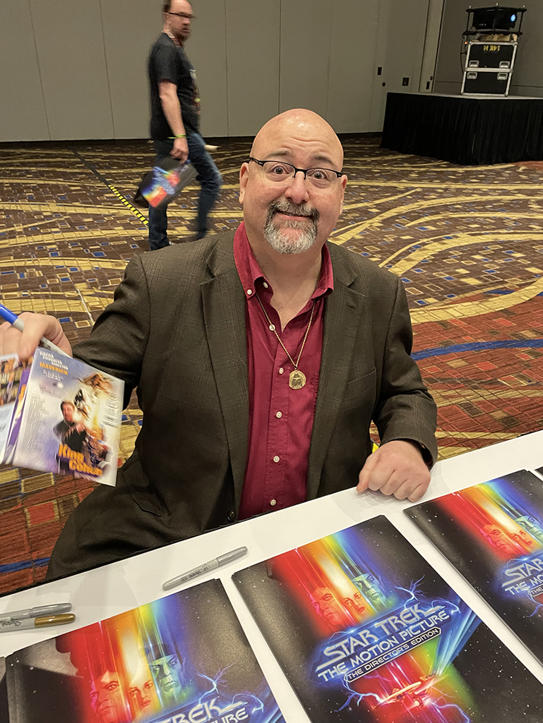 “Star Trek: Prodigy” Dal was wandering around the Exhibit Hall for excellent photo ops with fans, so I had to do that, of course! Then it was time to go to the Main Stage for the first time for the 4pm “Star Trek: The Motion Picture – The Director’s Edition Screening with producer David C. Fein.” Fans were given 11×17 mini-posters at the entrance, and David was holding an audience Q&A about the restoration of the film for the 4K UHD release (currently on Paramount+).  I must admit the film is even more visually stunning than the first time I saw it in December 1979 on a giant curved-screen theater in Washington, DC.  After the film, a table was set up so fans could have David sign their mini-posters.  All in all, while a little low-key, Day 1 of Star Trek: Mission Chicago was most enjoyable!