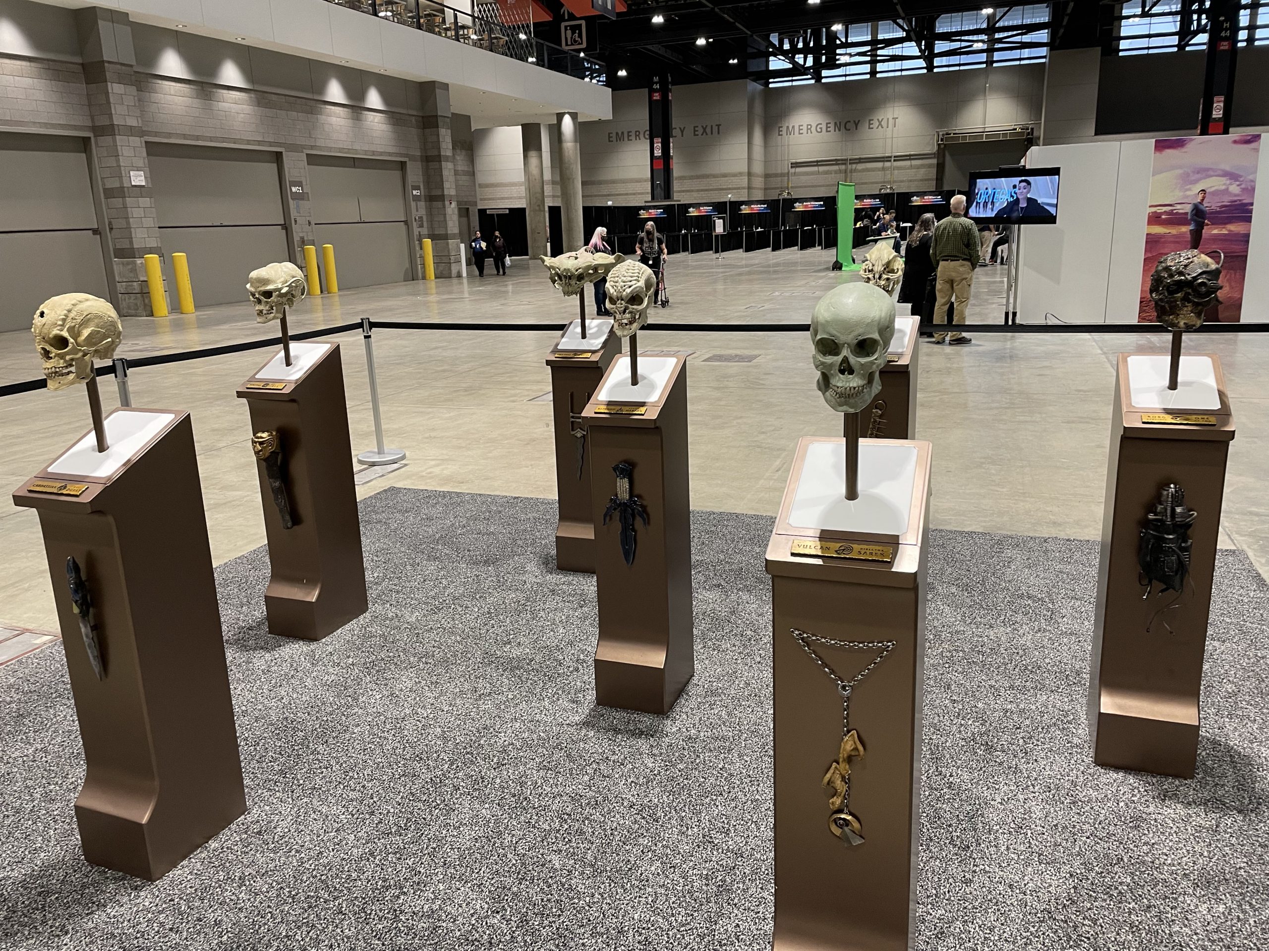 After this thoroughly entertaining panel, which had me in a “can’t wait for this show” mode, I ran into “Star Trek: Lower Decks” creator Mike McMahan in the hallway and couldn’t resist asking for a photo with him! Back in the Exhibit Hall I checked out the really cool “Star Trek: Picard Season 2” skull collection, seeing the following on display: