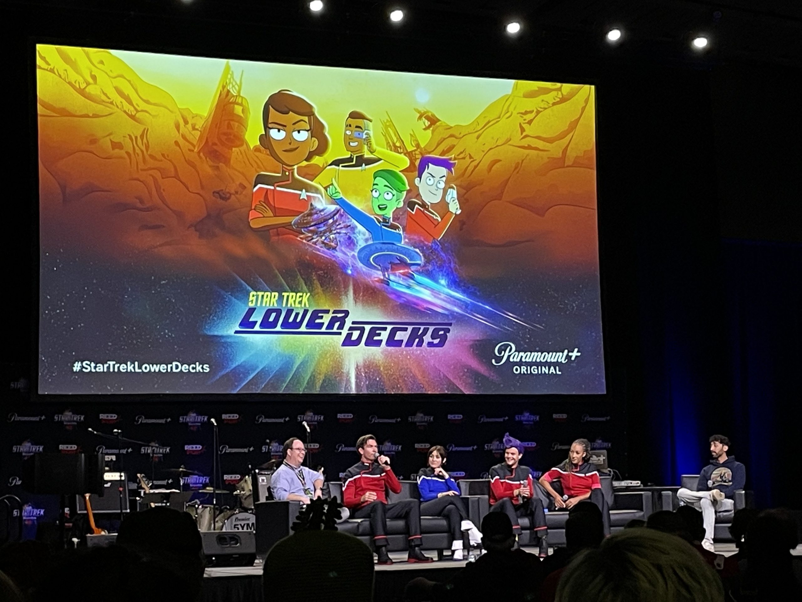 Time for Day 2 of Star Trek: Mission Chicago! I returned to the McCormack Place West Building. First up was going to the Main Stage Skyline Ballroom for the “Star Trek: Lower Decks Panel.” Everyone was given a raffle ticket that could be exchanged for an 11×17 mini-poster at the Merch booth after the panel. It was a wonderful panel, with the following stars introduced: creator Mike McMahan, Jerry O’Connell (“Commander Jack Ransom”), Noel Wells (“Ensign D’Vana Tendi”), Jack Quaid (“Ensign Brad Boimler” wearing a crazy purple hair piece like his character!) and Tawny Newsome (“Ensign Beckett Mariner”). They were all wearing the uniforms of their characters! Highlights: