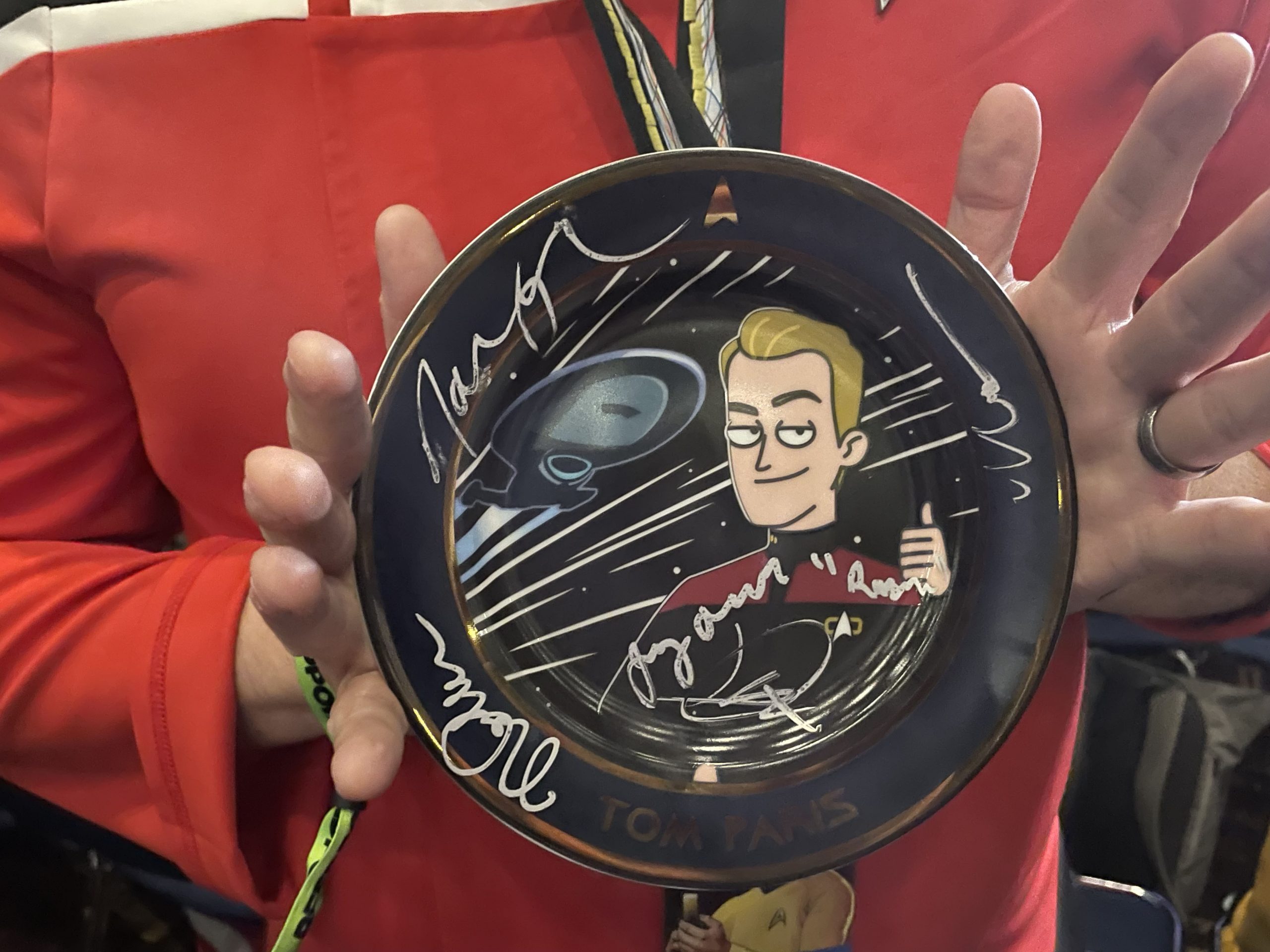 - Mike announced that “Season 3 rules.” No spoilers, but there’s a bat’leth game, some classic faces, interesting ships and a little bit about Boimler’s heritage in the first episode. He loves having week-to-week surprises but hates tidbits. Then he presented Jack with a “Tom Paris” plate!