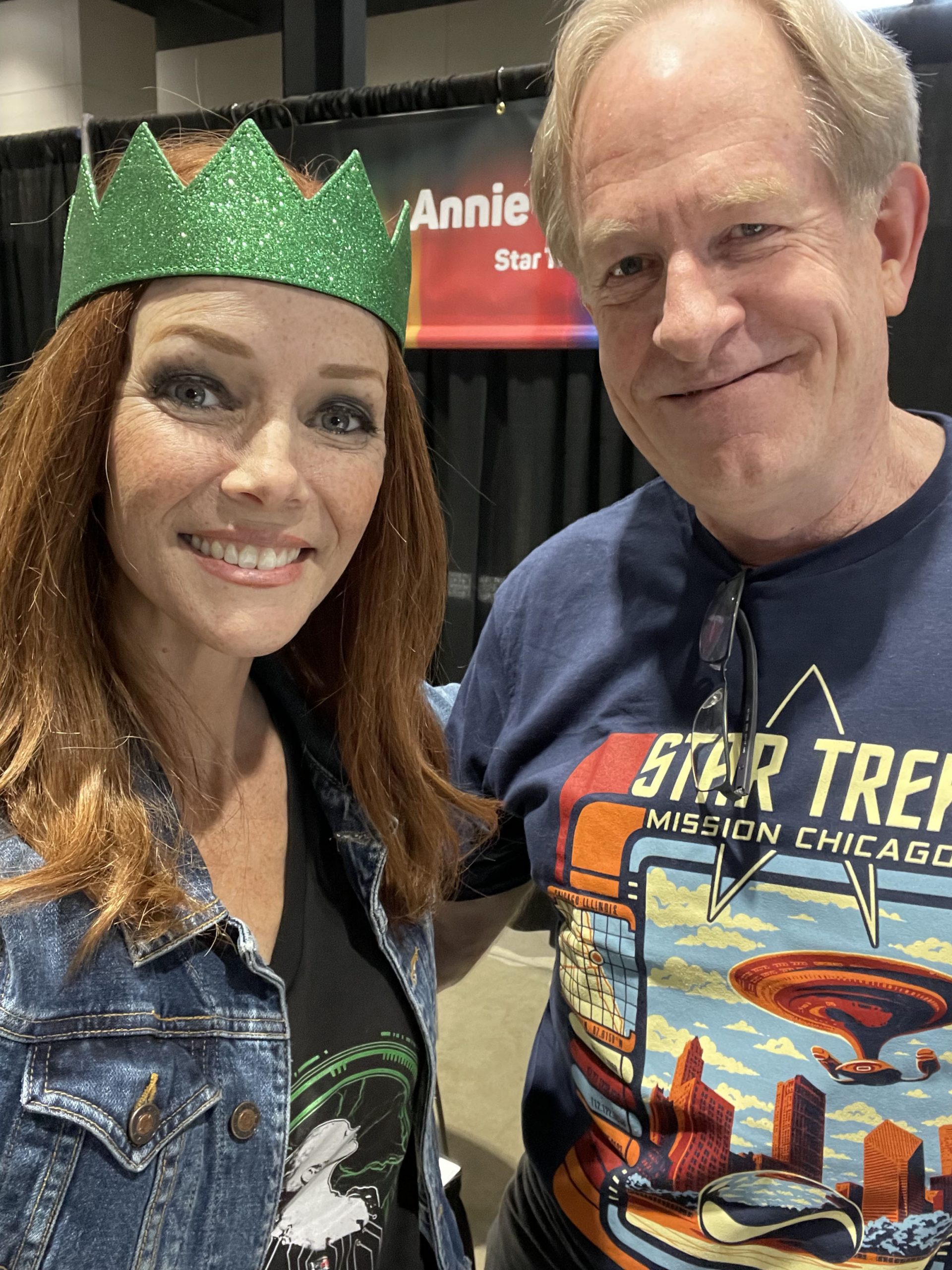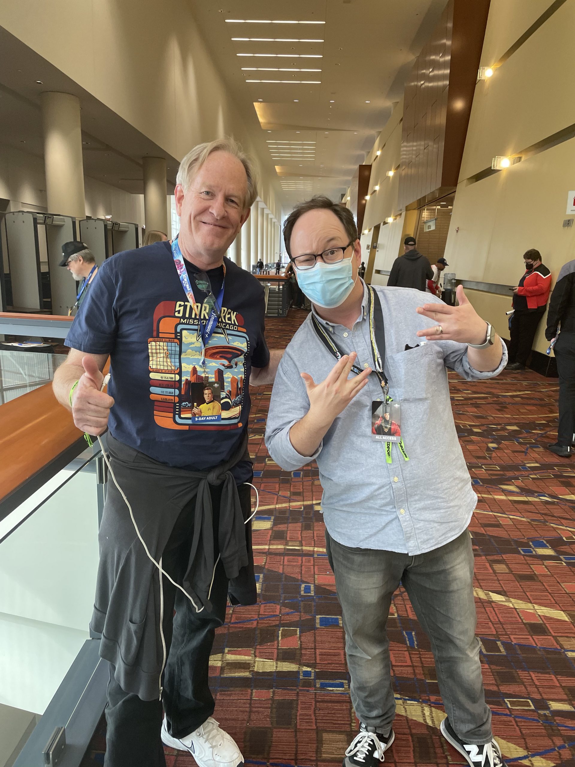 After this energetic and fun panel, the big announcement was that the next convention is Star Trek: Mission Seattle, coming May 26-28, 2023. Next, in a panel room I caught some of the “James Cromwell Spotlight” with the 82-year-old Academy Award-winner. He had the iconic role of Zefram Cochrane in “Star Trek: First Contact.” James was also in three episodes of “ST-TNG” and one episode of “ST-DS9,” often in full prosthetics. He said it took six hours, after getting a death mask made, then fitting this to his face completely enclosed and with contact lenses. It was sensory oppression. One good thing that happened was that when he was practicing jumping hay bales on his bike, he broke his collarbone; he was supposed to shoot the next day, but because of the prosthetic, they could put it on anyone, so someone else did his role! James said that make-up maestro Michael Westmore was brilliant and fun to watch, unique and wonderful. Around 1pm I had a photo opp with actor Anson Mount, “Captain Pike” in “Star Trek Discovery” and the upcoming “Star Trek: Strange New Worlds.” Anson did request plexiglass between himself and the fans because they are still filming “Star Trek: Strange New Worlds” and he’s back on set Monday.