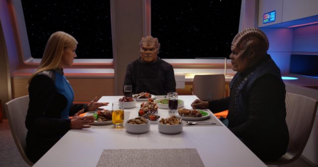 Topa ultimately fails the simulation but goes to Commander Grayson and asks to shadow her to learn what it is to be a Union Officer. During this process is when we learn Topa isn’t comfortable in her male body and ultimately learns she was born female. Now there is a lot that happens for her to find out, but this is a brief overview, and I don’t want to go into too much detail. However, I will tell you that Bortus is ultimately the one that helps Topa learn of her birth origins. Of course, Klyden is against this whole endeavor of Topa learning of her true nature, although we already know he was born a female too; we learned that back in season one when Topa was born. Klyden feels that it would do no good and bring Topa shame and ridicule if she were to learn of her true nature.