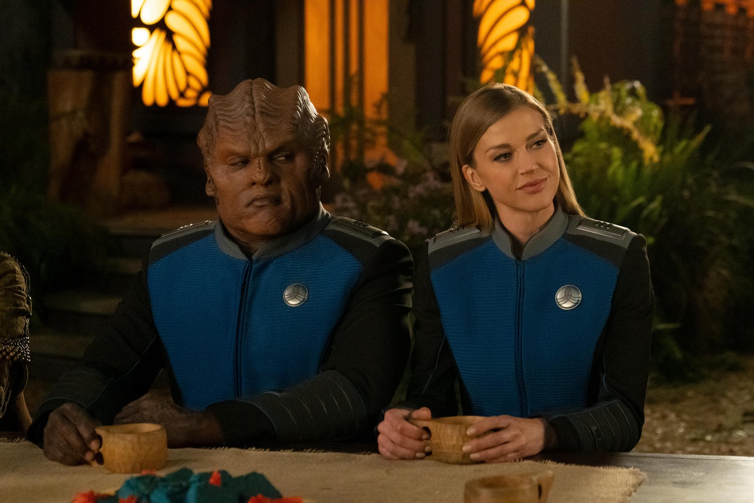 Much of the episode revolves around Haveena, the elder Moclan female, who’s an inspiration to Topa. The agreement in place established in a previous episode between her, Moclus, and the Union is that she would stop trying to smuggle female-born Moclans to the colony while the much more militant Moclus would grant the colony autonomy. On Moclus, male babies would be left alone, and any females are forced to be altered to male following birth. While it was an uneasy truce, the agreement obviously didn’t sit well with Haveena, as it allowed Moclus to continue the practice, and since Topa was changed back to her original birth gender in a previous episode (“A Tale of Two Topas”), the seeds were sown for the next contentious intergender conflict. We open the episode with Admiral Halsey sending Grayson and Bortus to The Sanctuary to ensure that there has been no breach of agreement between the colony and Moclus. Topa comes on the trip with Grayson and her father, and while they did initially deal with prejudice from the Moclan delegation there to do their side of the inspection, it is otherwise a very reaffirming experience for Topa to see other women like her, and the society they’ve built.