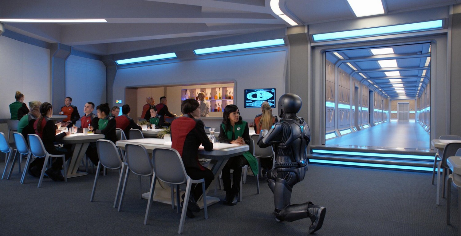 In the meantime, the Orville has been ordered to proceed to Sargus 4 to make contact with a science team there. Now, cast your mind way back to the first season episode “Majority Rule” (S01, E07) when then Lt. John LaMarr in his infinite wisdom demonstrates a “too grindy” dance to Lt. Alara Kitan on an important-looking statue, in a very public place, in the middle of the day, in the middle of the working week. Needless to say, this all escalated rather quickly, and, before you can say, “People are obsessed with popularity,” he is incarcerated and forced to undergo a trial by social media. Sargus 4 is very roughly at the same stage of technological and sociological development as present-day Earth. Only one young girl, Lysella, who works in a coffee shop, is able to help them. In fact, she is brought up to the Orville in a shuttle in order to help LaMarr boost his online profile, which is what ultimately saves him. Then the Orville leaves and sends its report back to the Union; all seems good. However, even though we don’t see it in that Season 1 episode, we are led to believe now that Lysella actually pinched a communicator while on the Orville. This is the beginning of the subplot of this episode. I don’t think it needed one, but I’m not one of the writers.
