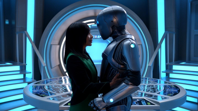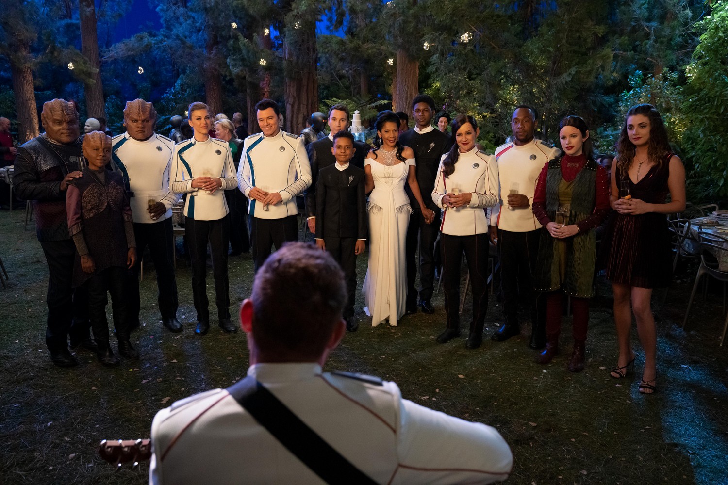Now back to the main plot, Isaac and Doctor Finn. Meanwhile, preparations for the wedding between Isaac and Dr. Finn continue and Bortus takes over the best man duties, much to Malloy’s annoyance. The result is a predictable but thoroughly entertaining stag night — because it’s so bad — and then an awesome hen night, complete with Isaac (not really, they’re in the simulator) showing every off-duty female member of the Orville’s crew just how well-oiled his servos are and that his nipple nuts come with optional tassels. Further trademark, subtle-yet-sidesplitting amusement is added when Isaac invites the entire Kaylon fleet to the wedding (that’s 4000 ships and 10 billion Kaylon). It’s really a beautiful event. Bortus makes a complete mess of the speech, so Malloy steps in and saves the day. Even Lt. Alara Kitan makes an appearance. We end the reception with Malloy pulling out his guitar and singing a song. It is in fact a beautiful ending to the episode, season, and what could be the series.