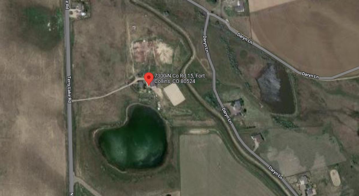 The address is 7300 N Co Rd 15, Fort Collins 80524. Now, be aware that it seems our popular map apps like to direct you to the wrong place. If you get to Daryn Rd (which is where your map is probably taking you) you have gone to far. There is a 55 MPH sign just before his mailbox where you should turn into the dirt driveway.