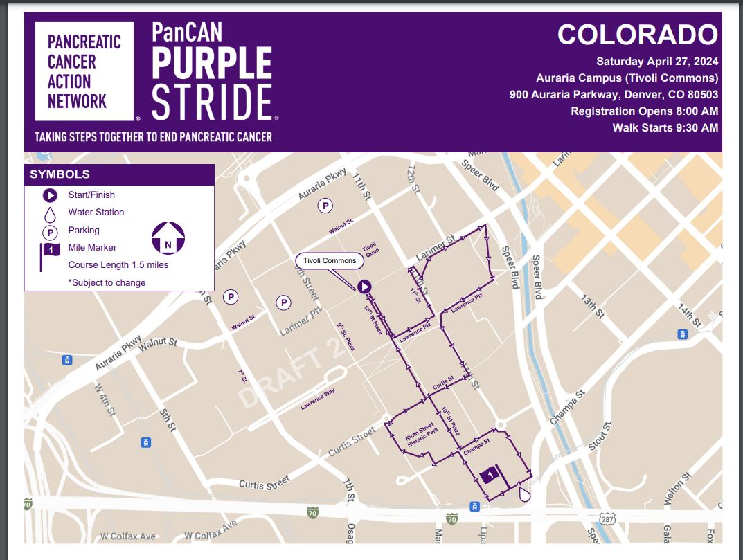 PurpleStride participants can enjoy complimentary parking at the Toyota 4Runner lot located at 1540 7th St, Denver, CO 80204 (these are the westernmost parking lots at Ball Arena). Please note that parking spaces are limited and available on a first-come, first-served basis. Approximate 10 minute walk to event site at Tivoli Quad.